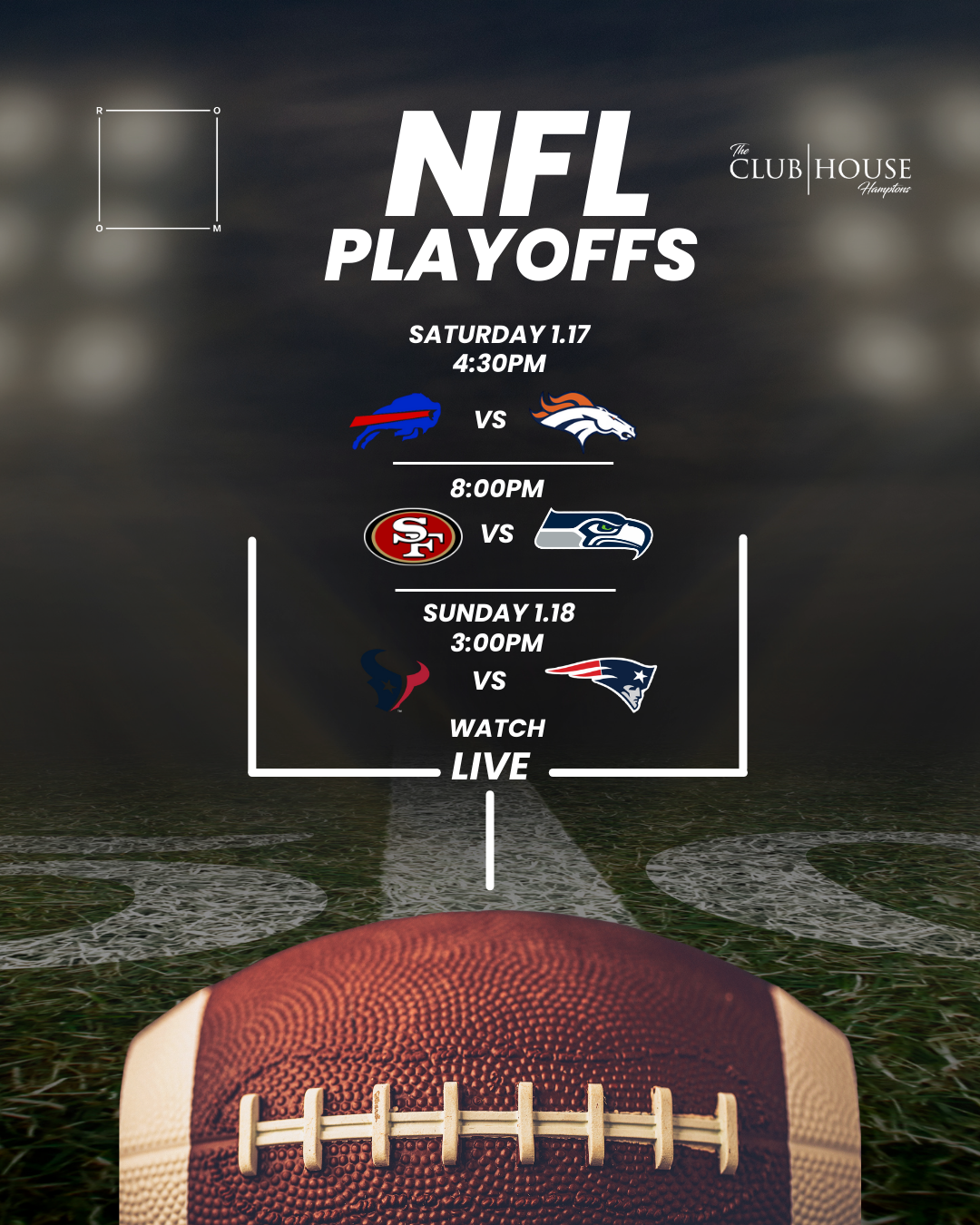 COME OUT & WATCH THE NFL DIVISIONAL GAMES ON 20+ SCREENS!